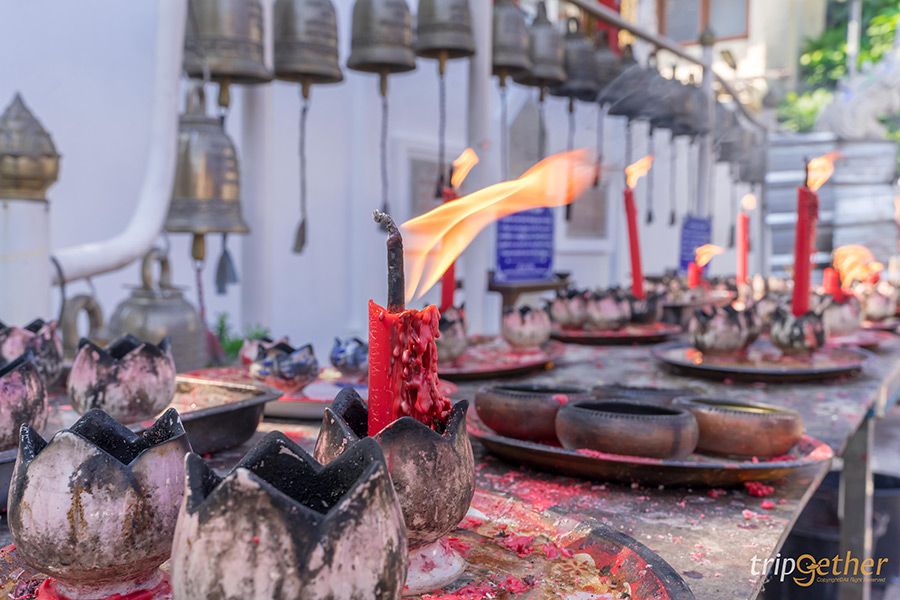 หลังจากสักการะขอพรเสร็จเราก็ลงมาจุดเทียนสีแดงหรือเทียนพระมหาอุปคุต ปราบมารบันดาลโชคลาภกันที่หน้าวิหารหลวง เตรียมรับความปังกันได้เลย