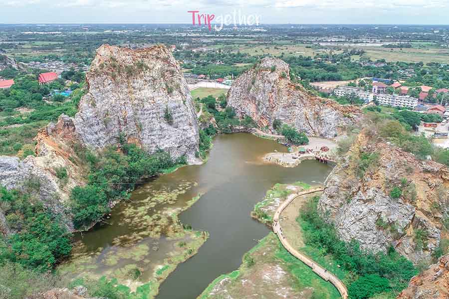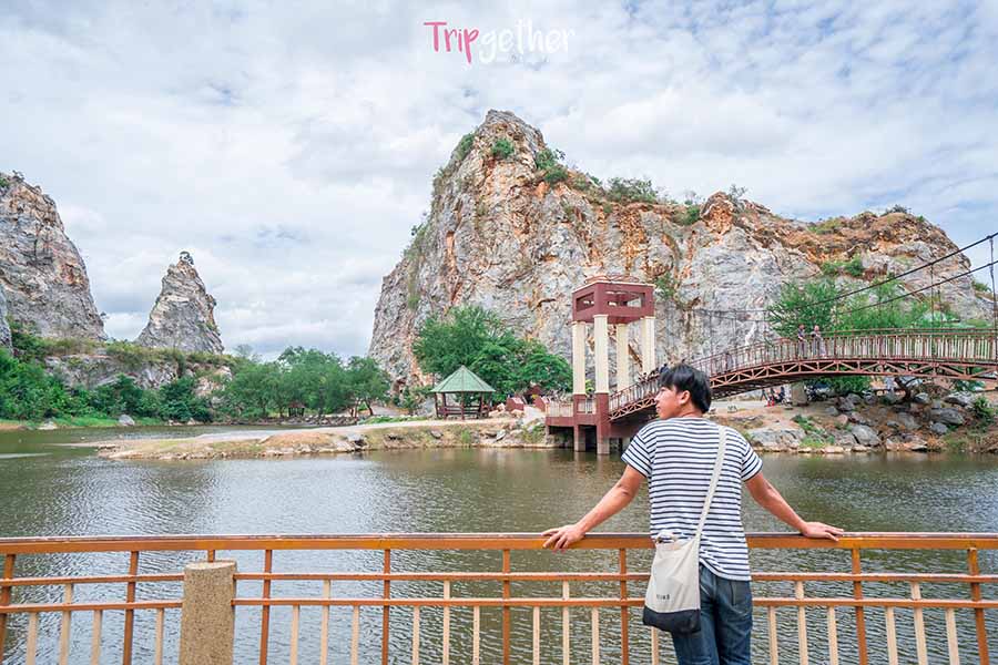 ที่นี่ขอบอกว่าอันซีนมาก เดิมที่เป็นแหล่งระเบิดหินสมัยรัตนโกสินทร์นู้น เป็นภูเขาหินลูกใหญ่ ล้อมรอบบึงน้ำธรรมชาติ ที่สำคัญยังมีสะพานแขวนให้เก็บถ่ายกัน