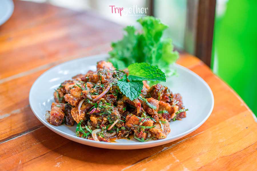 เมนุเด็ดต้องยกให้กับ ลาบหมูกรอบ และยำผักกูดทรงเครื่อง จานละ 150 บาท