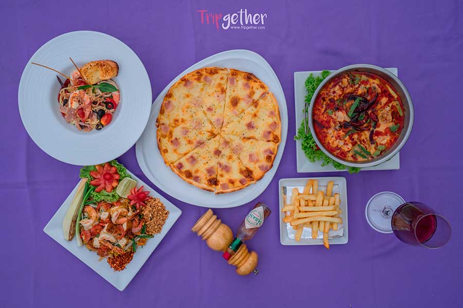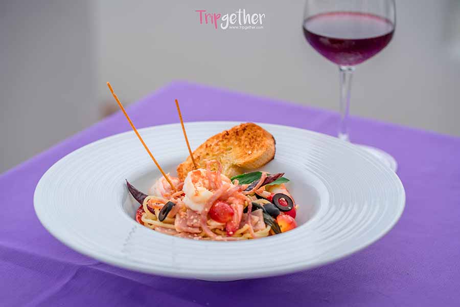 เมนูเด็ดแนะนำ สปาเก็ตตี้น้ำมันมะกอกเสริฟกับมะกอกดำ 220 บาท และพิซซ่าฮาวาเอี้ยนแป้งบางกรอก 350 บาท