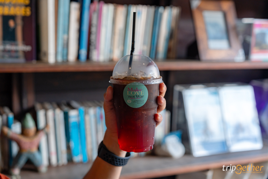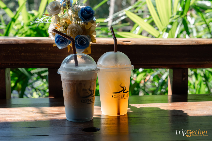 เมนูของที่นี่จะเป็นเมนูเครื่องดื่มเป็นหลัก มีให้เลือกอยู่หลากหลายทั้งเมนูที่เป็นกาแฟ และเมนูเครื่องดื่มอื่นๆ แต่ด้วยความที่เรายังต้องเดินทางอีกไกล เลยเลือกสั่งเป็น ลาเต้อัญชัน ราคาอยู่ที่แก้วละ 90 บาท และน้ำผึ้งมะนาว 65 บาท เอามาเติมความสดชื่นให้เต็มตื่นกันแบบเน้นๆ