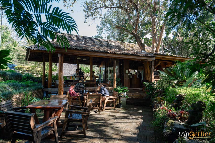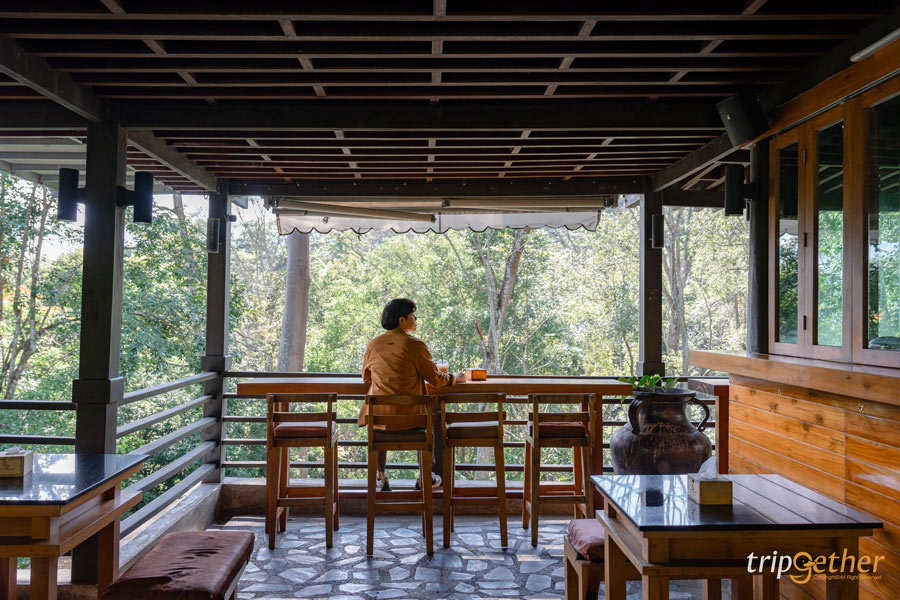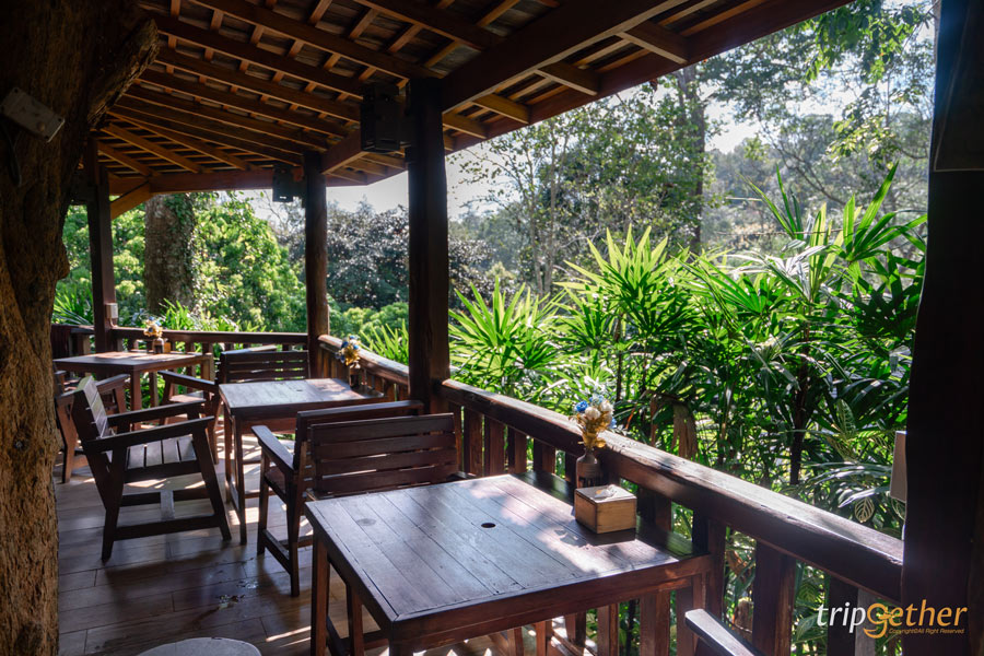 เดินเข้ามาในตัวร้านเราก็ถึงบางอ้อทันที ว่าทำไมคนถึงเยอะมาก ก็เพราะว่าบรรยากาสของร้านดีมากๆ ตัวร้านเป็นอาคารไม้เล็กๆ 2 ชั้นแบบเปิดโล่ง ตั้งอยู่บนเนินเขาที่สามารถมองเห็นวิวที่โล่งด้านล่างและแนวเขาไกลๆ พร้อมกับวิวพระอาทิตย์ตกได้แบบพาโนรามา