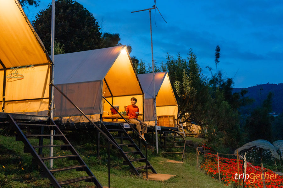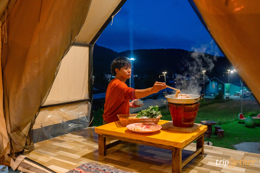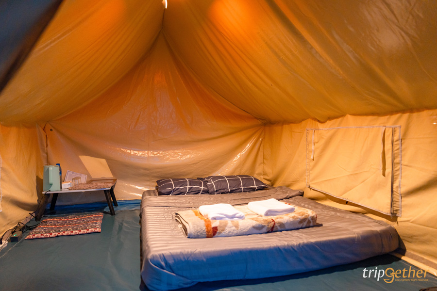 ภายในเต๊นท์มีเตียงที่นอน 2 คนได้แบบสบายๆ มีชุดโต๊ะ เบาะแบบญี่ปุ่น กระติกน้ำร้อน แถมยังมีปลั๊กให้สำหรับเสียบชาร์จแบต แถมด้านหน้าห้อง ยังเป็นพื้นที่ของระเบียงที่สามารถออกมานั่งห้อยขา รับลมเย็นๆ ได้แบบสบายๆ