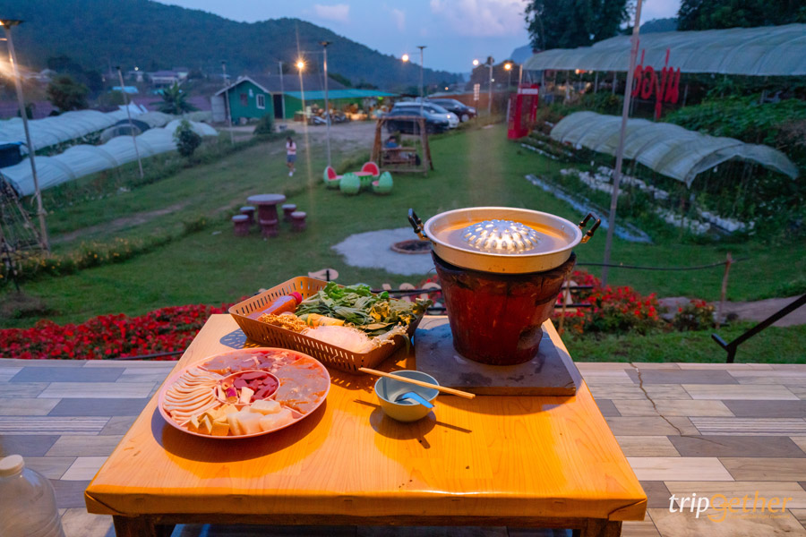 แน่นอนว่าเดินทางเหนื่อยมาทั้งวัน ก็ต้องจัดหมูกระทะกันสักมื้อ ซึ่งบ้านสวนอริยะก็มีบริการให้พร้อม ทั้งหมูหมัก ไก่นุ่ม ไส้กรอก ปูอัด ลูกชิ้น เต้าหู้ และผักหลากหลายชนิด ราคาอยู่ที่ชุดละ 500 บาทเท่านั้น และอยากนั่งกินตรงไหนก็แจ้งกับที่พักได้เลย สะดวกมากๆ
