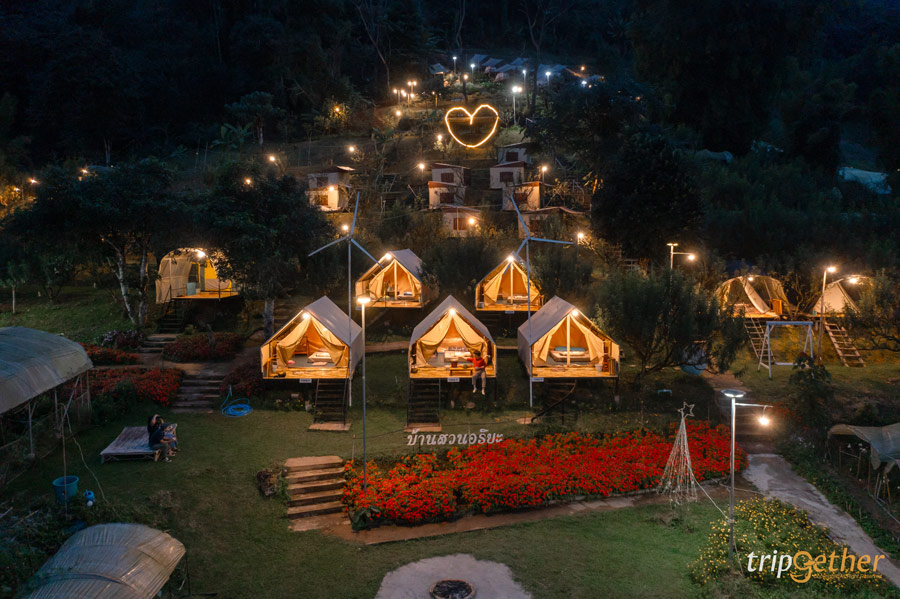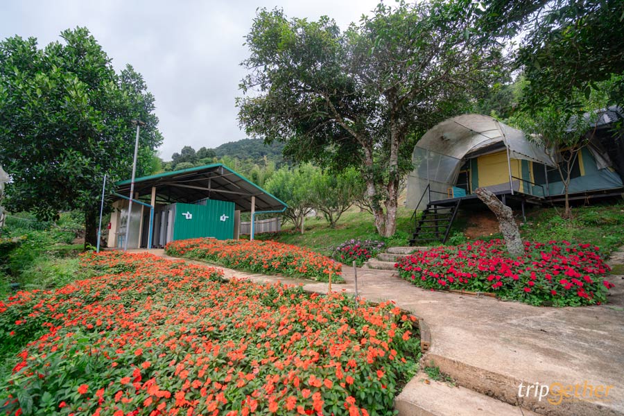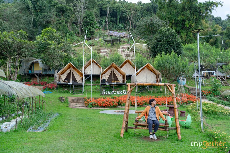 ห้องพักของบ้านสวนอริยะมีให้เลือกหลายรูปแบบตามความชอบของผู้เข้าพัก แต่ห้องที่เราเลือกก็คือ ห้องพักแบบเต๊นท์ ที่อยู่ติดกับแปลงดอกไม้น่ารักๆ ราคาอยู่ที่ 800 บาท/ 2 คน