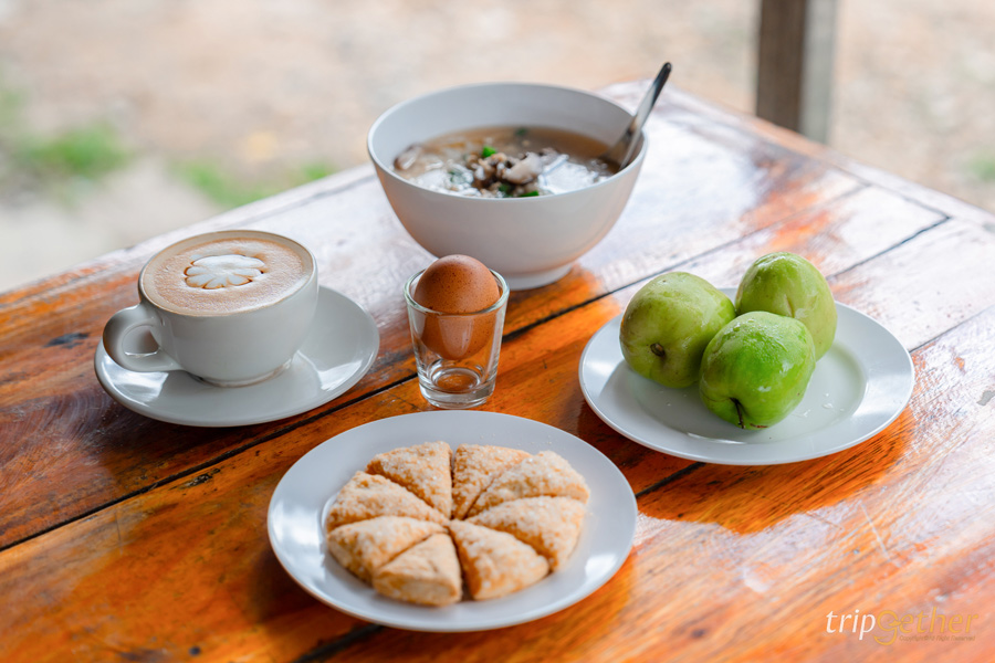 ส่วนเมนูอาหารเช้า เป็นข้าวต้มเห็ดหอมหมูสับ เสริ์ฟคู่กับไข่ลวก มีขนมปังกรอบและกาแฟร้อน ปิดท้ายด้วยพุทธรานมสดลูกใหญ่ ถือว่าเป็นการจัดเต็มมื้อเช้าเติมพลังแบบเต็มๆ ก่อนเดินทางกันต่อ