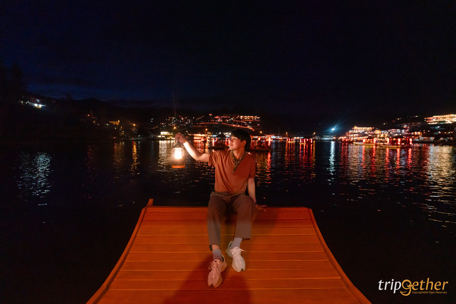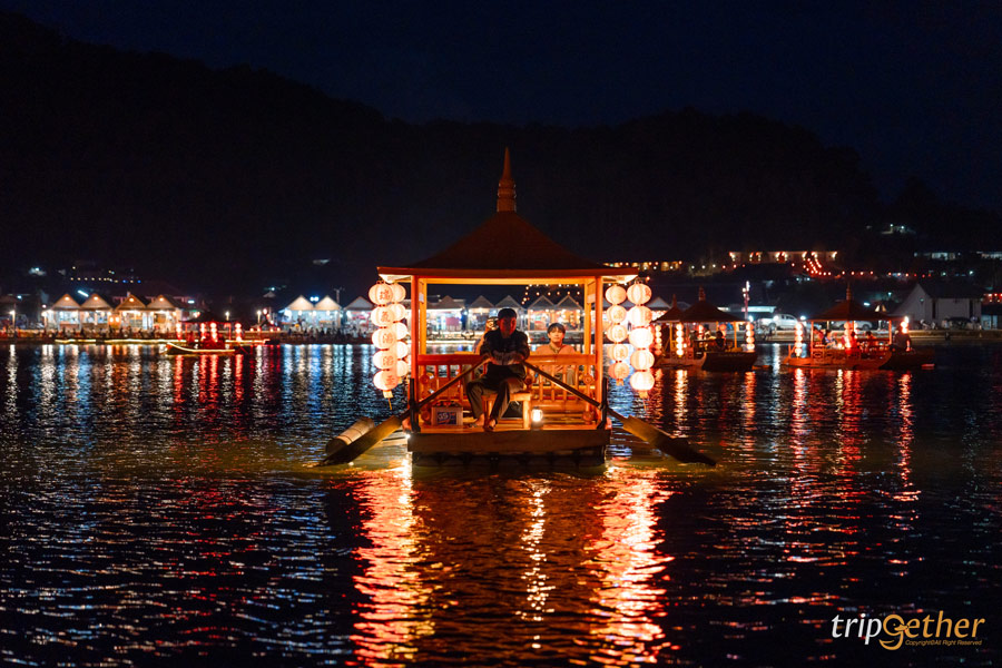 เรือที่เรานั่งเป็นเรือลำเล็ก นั่งได้ 4 คน มีเก๋งแบบจีนที่ประดับโคมไว้อย่างสวยงาม โดยใน 1 รอบ จะใช้เวลาล่องประมาณ 40 นาที และถ้าเราอยากได้ภาพมุมไหน หรืออยากล่องไปชมวิวตรงไหนก็บอกพนักงานพายเรือได้เลย
