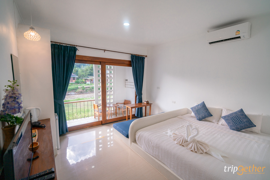 ภายในห้อง Deluxe River มีพื้นที่กว้างขวาง การตกแต่งเน้นโทนสีที่เรียบง่ายแต่ให้ความรู้สึกอบอุ่น ผ่อนคลาย มีสิ่งอำนวยความสะดวกครบ ทั้งทีวี ตู้เย็น กาน้ำร้อน ไดร์เป่าผม และอื่นๆ อีกมากมาย ในส่วนของห้องน้ำก็แบ่งสัดส่วนได้อย่างดี