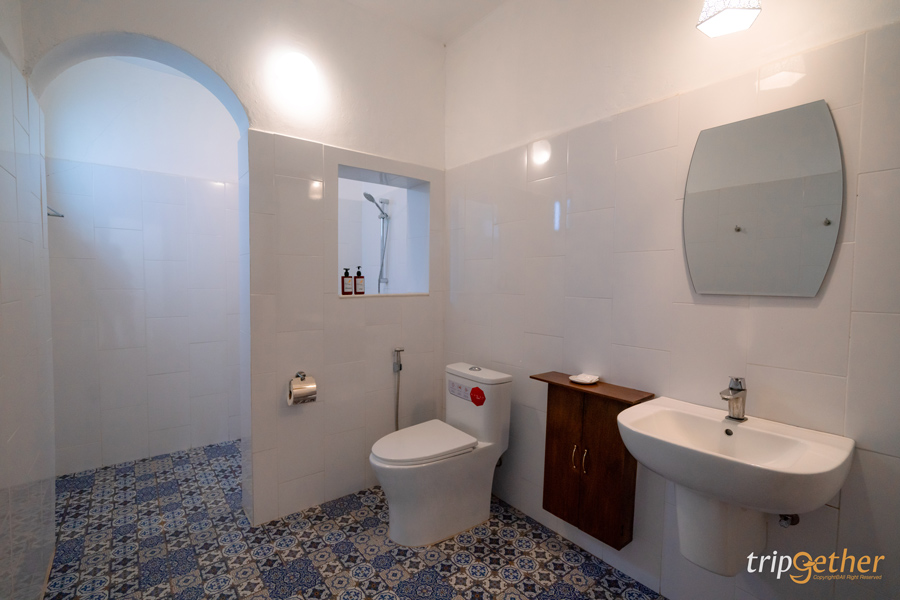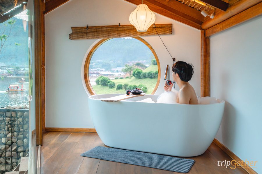 ความพิเศษอีกอย่างก็คืออ่างอาบน้ำที่ตั้งอยู่ด้านริมของห้อง ติดกับกระจกวงกลมที่เพียงแค่มองออกไปก็จะได้เห็นทั้งวิวไร่ชาและทะเลสาบแบบฉ่ำๆ แถมยังมีชุดชาเสิร์ฟให้จิบไป แช่น้ำไปด้วย