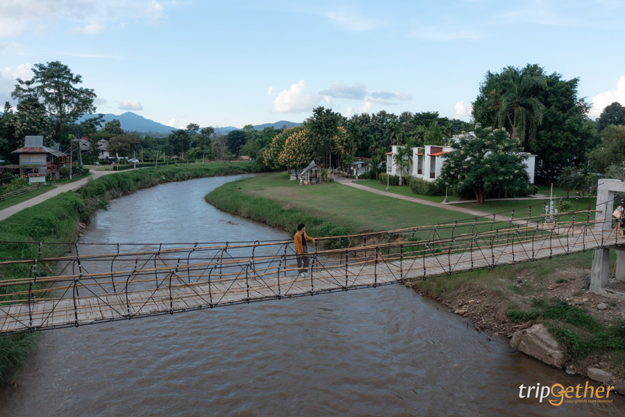 บนสะพานใช้เป็นมุมถ่ายรูปสวยๆ ได้หลายมุมเลย แถมระหว่างเดินเล่นยังสามารถมองวิวแม่น้ำปายและภูเขาได้แบบชัดเจนด้วย