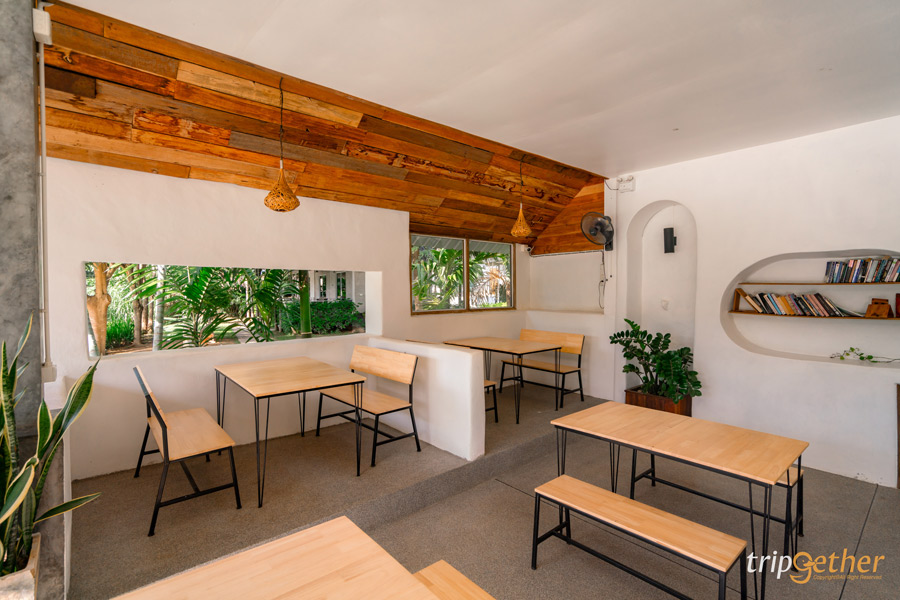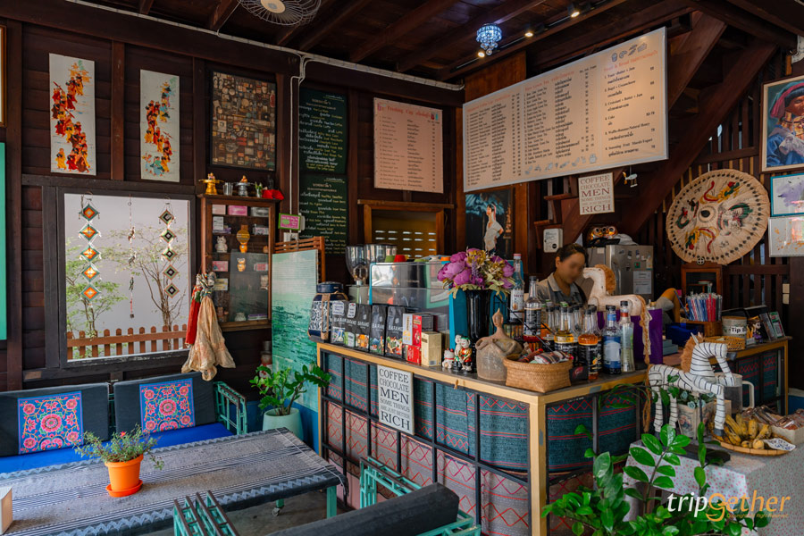 ภายในร้านเป็นแบบเปิดโล่ง เน้นการตกแต่งแบบมีเสน่ห์มากๆ เหมือนได้มาเที่ยวชมงานคราฟต์ยังไงอย่างงั้น ในส่วนของเมนูก็มีให้เลือกเยอะใช้เล่น ทั้งกาแฟ เครื่องดื่มอื่นๆ ไปจนถึงขนม และที่น่ารักมากๆ เลยก็คือมีกล้วยน้ำว้าให้ชิมฟรีด้วยนะ เด็ดได้จากหวีเลย