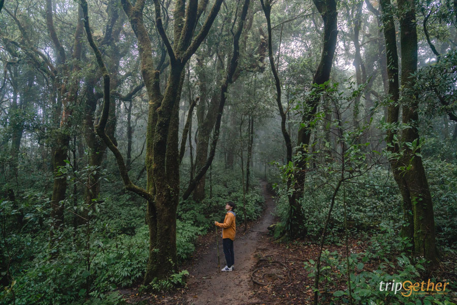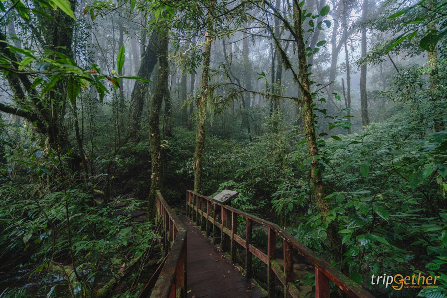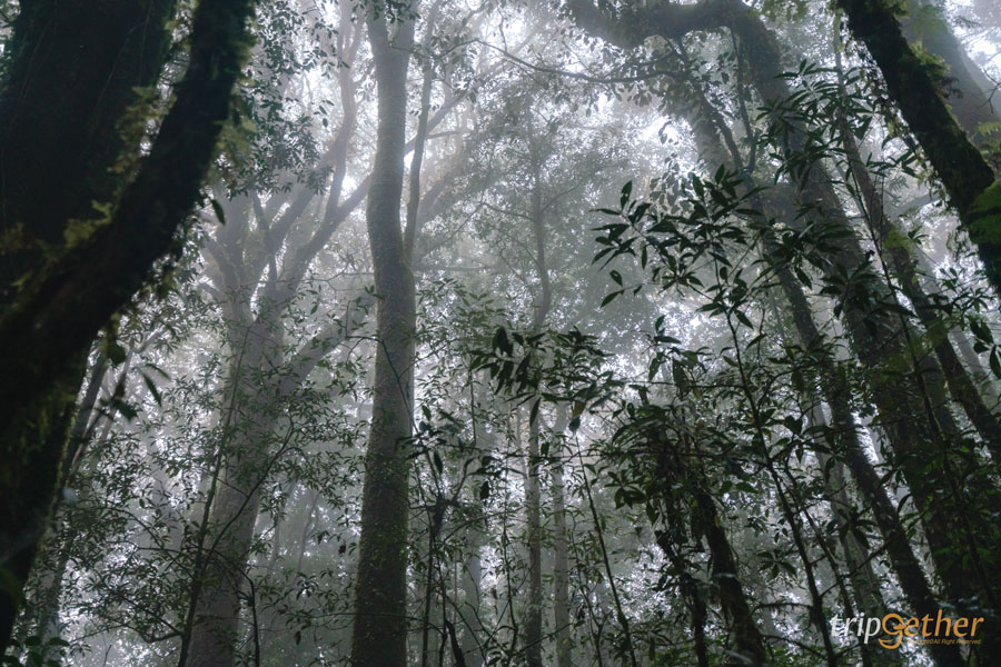 ระหว่างเดินอาจจะมีหอบกันบ้าง แต่ความสดชื่น ความอุดมสมบูร์ของป่าไม้ก็ทำให้คลายเหนื่อยได้ดีเลยทีเดียว และทั่วทั้งป่ายังมีเมฆและหมอกลงมาปกคลุมยอดไม้อยู่ตลอดๆ