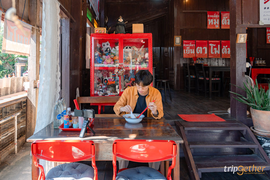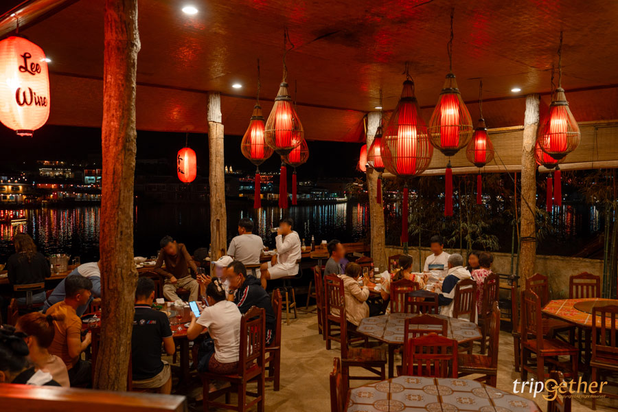 ภายในมีที่นั่งให้เลือกหลากหลายมุม ทั้งด้านในโถงกลางร้านหรือจะเป็นบาร์ริมน้ำ ทั่วทั้งร้านตกแต่งด้วยโคมสีแดง ให้บรรยากาศแบบเหมือนได้นั่งกินอาหารในภัตรคารจีน