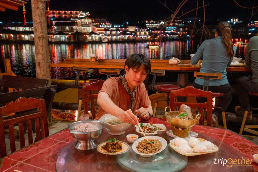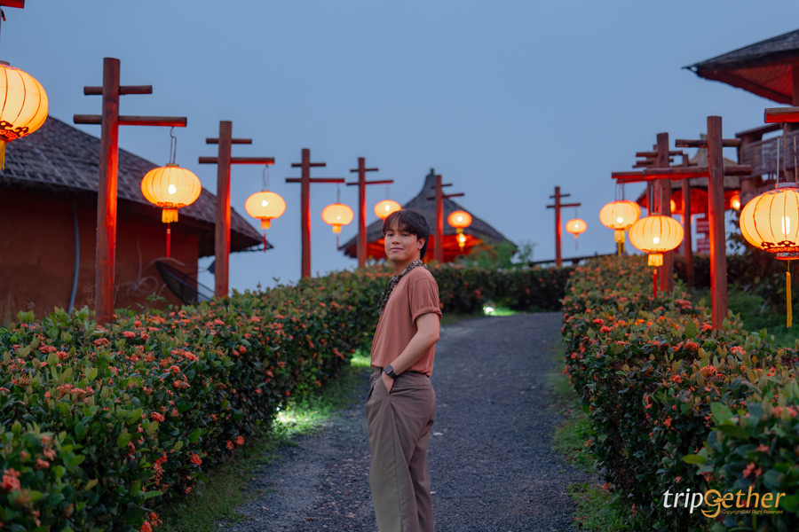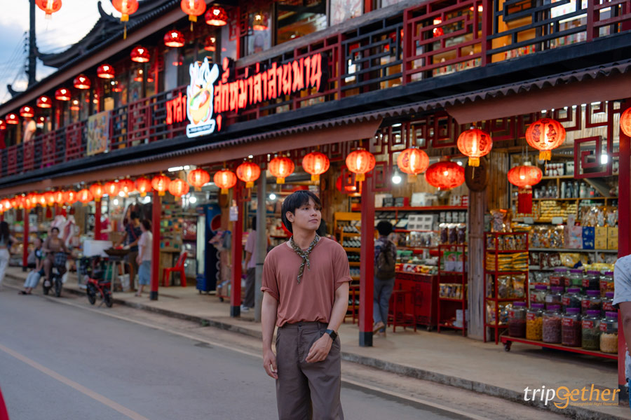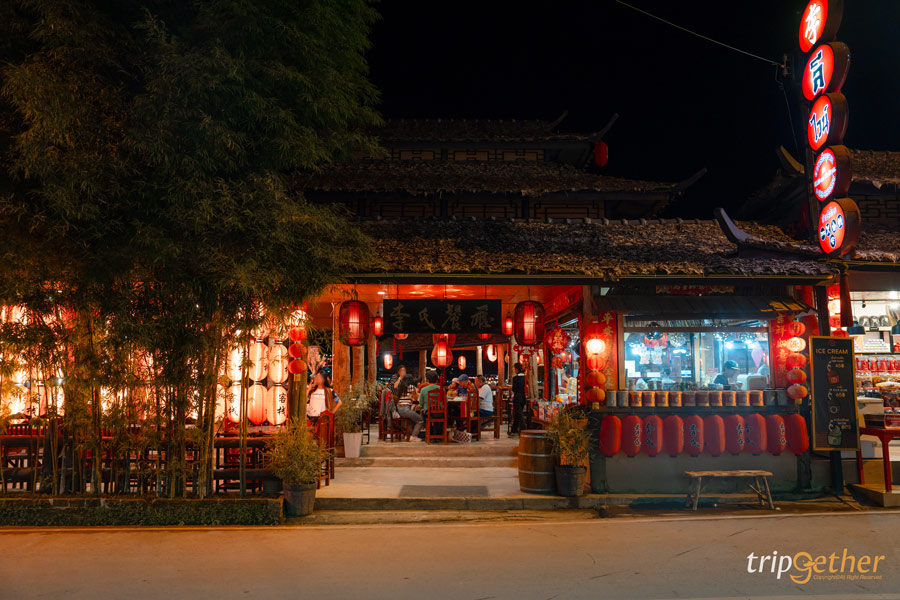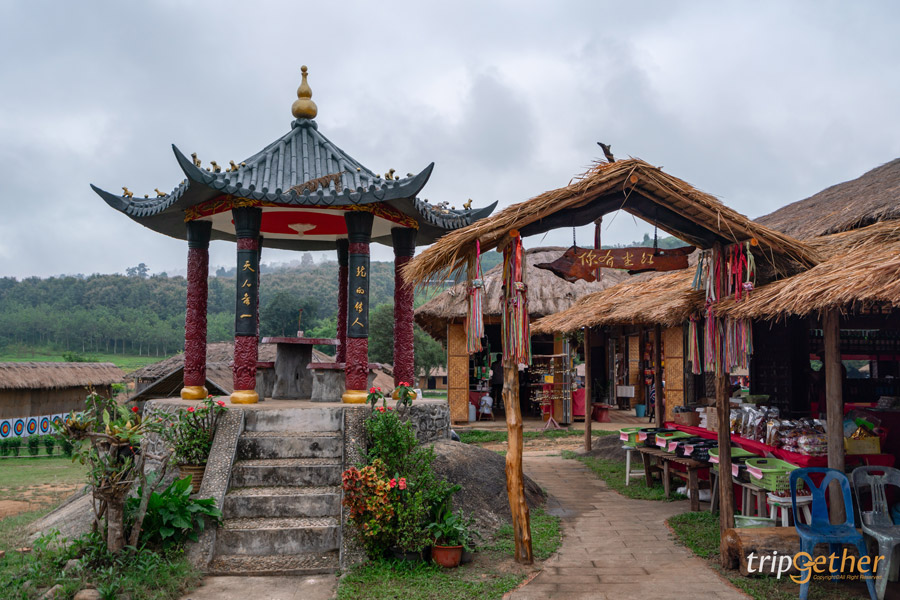 บรรยากาศในหมู่บ้านรักไทยอบอวลไปด้วยเสน่ห์แบบจีนยูนนาน และเต็มไปด้วยความคึกคักของร้านค้า ผู้คน และสีสันของโคมไฟที่ตกแต่งอยู่ทั่วทั้งหมู่บ้าน
