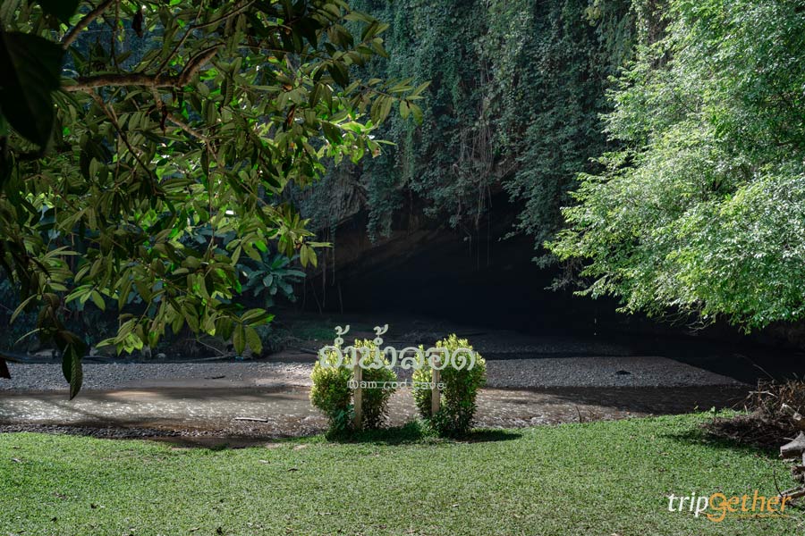 เดินผ่านแนวป่ามาได้ประมาณ 10 นาที เราก็มาถึงบริเวณปากถ้ำแล้ว ซึ่งด้านหน้าจะมีลำธารใหญ่ไหลลอดออกมาจากถ้ำ แถมปากถ้ำยังกว้างและมีต้นไม้ปกคลุมอยู่แน่นเลยด้วย ให้ฟีลแบบโลกดึกดำบรรพ์สุดๆ