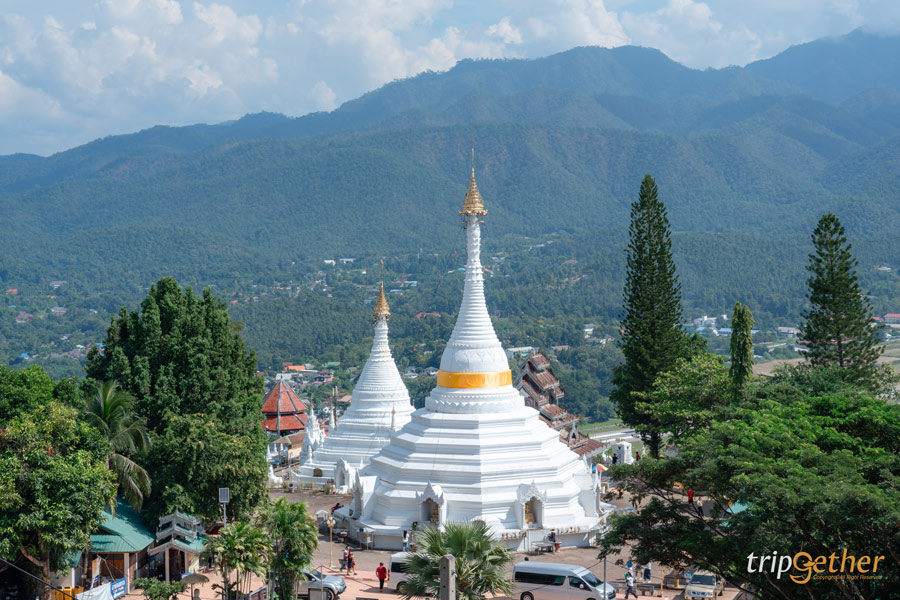 แต่ก่อนเข้าไปเที่ยวในตัวเมือง เราแวะขึ้นมาที่วัดพระธาตุดอยกองมู วัดศักดิ์สิทธิ์คู่บ้านคู่เมืองแม่ฮ่องสอนที่ตั้งอยู่บนยอดดอยติดกับตัวเมือง เพื่อมาไหว้พระ ขอพรเพื่อความเป็นสิริมงคลกันก่อน
