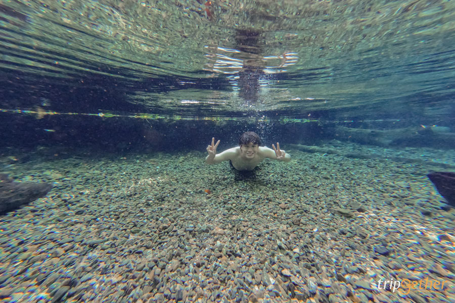 มาถึงแล้วไม่รอช้า รีบเปลี่ยนชุดสำหรับแช่น้ำ แล้วก็ลงไปนั่งแช่ตัวสบายๆ กันสักหน่อย ถึงจะเป็นนำ้พุร้อน แต่อุณหภูมิของน้ำอยู่ในระดับที่กำลังดี คือไม่ร้อนเกินไป เรียกได้ว่าอุ่นแบบผ่อนคลาย แถมน้ำที่นี่ใสมากๆ มองเห็นพื้นด้านล่างได้แบบชัดแจ๋ว