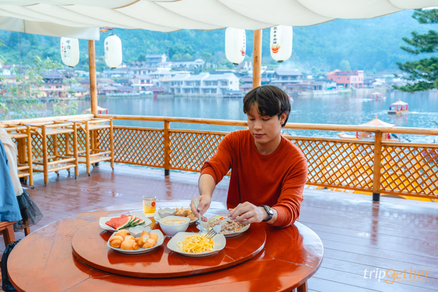 อาบน้ำเปลี่ยนชุดกันแล้ว ก็ออกมากินอาหารเช้ากัน ซึ่งห้องอาหารของที่พักจะตั้งอยู่ติดในภูรักษ์น้ำ รีสอร์ท ซึ่งอาหารจะเป็นไลน์บุฟเฟ่ต์ ที่เน้นเป็นเมนูอาหารจีนยูนนาน มีทั้งผัดหมี่ยูนนาน หมูผัดพริกขิง ข้าวผัดยูนนาน ปาท่องโก๋ หมั่นโถว แถมยังมีเครื่องดื่มเติมความสดชื่นอย่างเก็กฮวยป่าผสมน้ำผึ้งด้วย