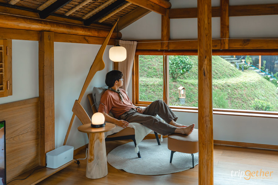 ภายในห้องพักเน้นการตกแต่งอย่างเรียบง่ายด้วยโทนและวัสดุแบสไตล์โมเดิร์นเอเชียน การออกแบบนี่คือต้องยกนิ้วให้เลย ทุกองค์ประกอบ ทุกสัดส่วนของห้อง รวมทั้งการจัดวางเฟอร์นิเจอร์ลงตัวไปหมดทุกย่าง และที่เป็นไฮไลท์เลยก็คือในห้องจะมีกระจกใสบานใหญ่ที่สามารถมองเห็นวิวทะเลสาบ ภาพหมู่บ้าน และท้องฟ้าได้ ไม่ว่าจะนั่งอยู่ตรงไหนก็มองเห็นทุกมุม