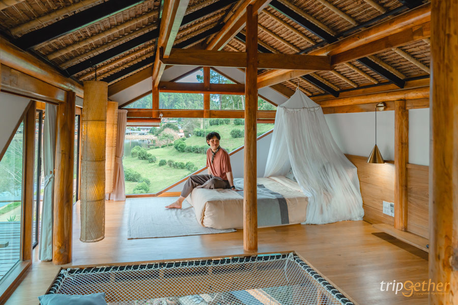 ด้านชั้น 2 ก็มีเก้าอี้เอนหลังติดกับกระจกใจวิวสวนสวยๆ เปลตาข่ายกลางห้อง พร้อมกับเตียงที่มีมุ้งคลุมน่ารักๆ นอกจากนี้ยังมีพื้นที่ของระเบียงด้านนอกให้ออกไปนั่งห้อยขารับลม ชมวิวสบายๆ