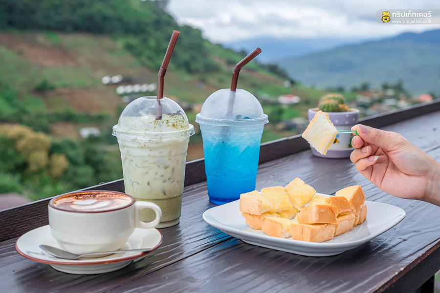 เดินทางมาเหนื่อยๆ ผมเลยมานั่งพักกันที่โซนคาเฟ่ของ ม่อนสายลม ที่ใช้ชื่อว่า ม่อนสายลม คอฟฟี่ สั่งชาเขียวมัทฉะ บูลฮาวายอิตาเลี่ยนโซดา และขนมปังปิ้งมานั่งชิลล์ดูวิวหลักล้านกันจนหายเหนี่อย