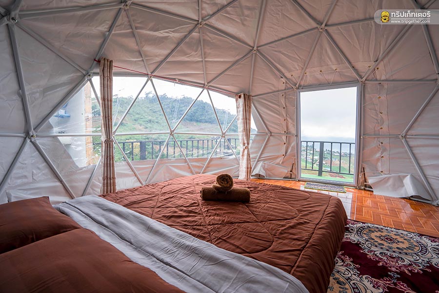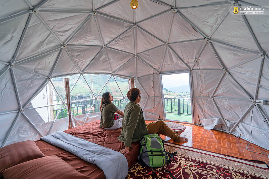 ภายในตัว เต็นท์โดม มีพื้นที่กว้างขวางเป็นทรงกลม และปูพื้นด้วยกระเบื้องดูสะอาดตา อีกทั้งยังมีที่นอนสำหรับนอน 2 คนพร้อมชุดเครื่องนอน และยังมีพัดลม ชั้นวางของ น้ำเปล่า แก้วน้ำ ผ้าเช็ดตัว และปลั๊กไฟให้อีกด้วย