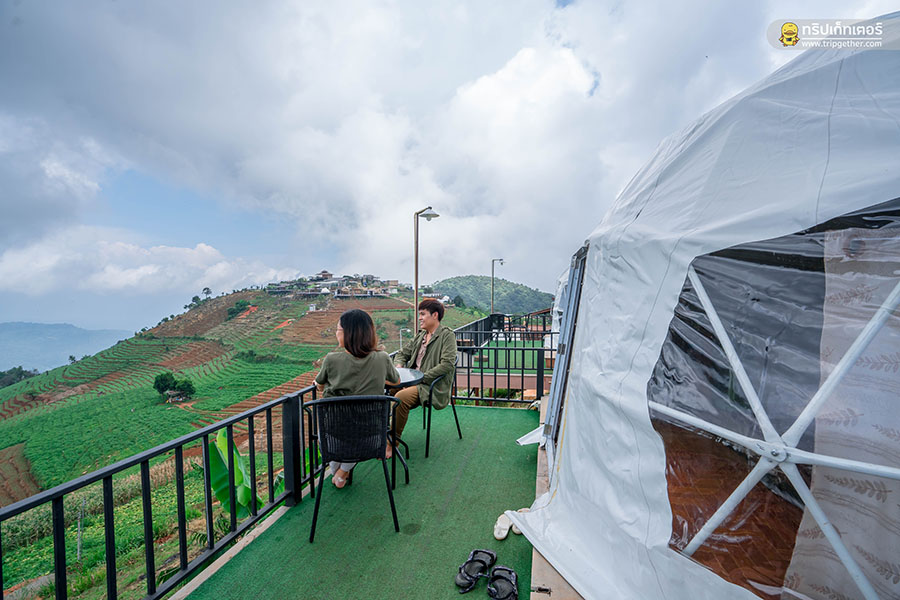 ด้านหน้า เต็นท์โดม ยังมีพื้นที่ไว้ให้นั่งชิลล์ ยิ่งช่วงยามเย็นจะได้เห็นพระอาทิตย์ตกหลังเขา ยิ่งแสงพระอาทิตย์ตกในช่วงหน้าหนาวบอกเลยว่าต้องฟินสุดๆ เพราะจะได้เห็นแสงทไวไลท์ที่สวยงาม หรือจะสั่งหมูกระทะมากินที่มุมนี้รับรองว่าฟินสุดๆ ซึ่งไม่ต้องออกไปหากินที่ไหนไกล เพราะ ม่อนสายลม มีทั้งเช็ตหมูกระทะและอาหารไว้ให้บริการ