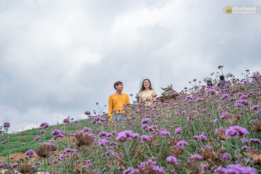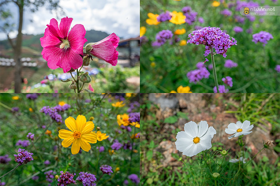 นอกจากนี้แล้วบริเวณรอบๆ ม่อนสายลม ยังมีมุมให้ถ่ายรูปสวยๆ มากมายทั้งทุ่งดอกไม้ ที่มีทั้งดอกคัตเตอร์สีขาว ดอกเวอร์บีน่าสีม่วง และดอกคอสมอสสีชมพู