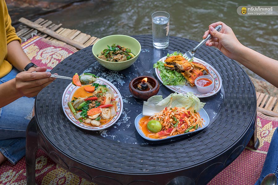วันนี้ผมสั่ง ส้มตำไทย ผัดผักรวม ไก่ย่าง และแกงคั่วไก่มากินชิลล์ๆ ฟังเสียงน้ำไหลเพลินๆ
