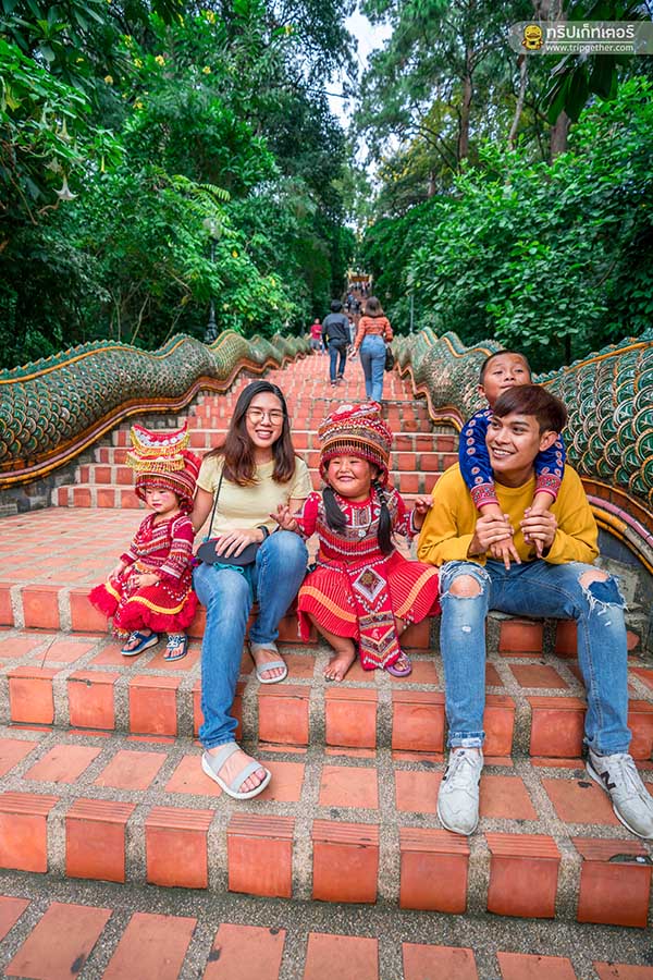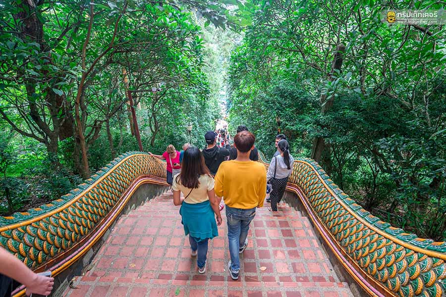 เมื่อขึ้นมาถึงด้านล่างวัดพระธาตุดอยสุเทพจะต้องเดินขึ้นบรรไดนาค 306 ขั้น หรือใครที่กลัวเดินขึ้นไม่ไหวที่นี่ยังมีบริการรถรางไฟฟ้าไป – กลับ ราคา 20 บาท ผมเลยเลือกที่จะขึ้นรถรางเพราะเมื่อยล้าจากการขับรถมาทั้งวัน