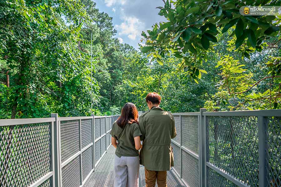 และที่เป็นไฮไลท์ของที่นี่ก็คงหนีไม่พ้นทางเดินธรรมชาติลอยฟ้า Canopy Walks ที่จะทำให้เราได้เห็นป่าและธรรมชาติจากมุมบน แล้วยังมีโอกาสได้เห็นกิ่งก่าบินอีกด้วย ใครที่เป็นสายถ่ายรูป สายเซลฟี่จะต้องชอบมุมนี้อย่างแน่นอน ระหว่างทางเดินยังมีพื้นกระจกให้ไปยืนพิสูจน์ความกล้าด้วยนะ