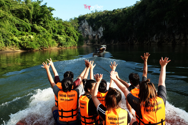หลังจากอิ่มหน่ำกับเมนูอาหารไทยที่ร้านคีรีธารา เราก็ออกเดินทางกันต่อ มาถึงไทรโยคก็ประมาณบ่ายโมงเกือบบ่ายสอง ก็ได้เวลาเช็คอินเข้าที่พักกันพอดี โดยที่พักเราในคืนนี้จะเป็นที่พักแบบไฮท์ อะเวย์ ที่ต้องนั่งเรือข้ามแม่น้ำกันไปนอนกันเลยทีเดียว