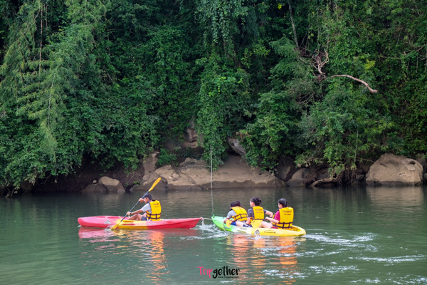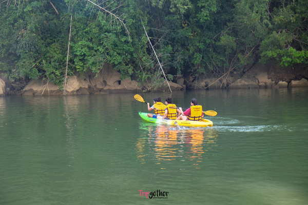 หลังจากเช็คอินเข้าที่พัก เก็บกระเป๋ากันเรียบร้อย เราก็เปลี่ยนเสื้อผ้ามาเล่นกัน พายเรือคายัค (เรือฟรี) กันสักหน่อย เพื่อรอเวลาล่องแพกับทางรีสอร์ทในช่วง 4 โมงเย็น สำหรับกิจกรรมฟรีในที่พักก็จะมีพายเรือคายัค มีล่องแพ มีสระว่ายน้ำกกลางแจ้งแบบลอยน้ำ