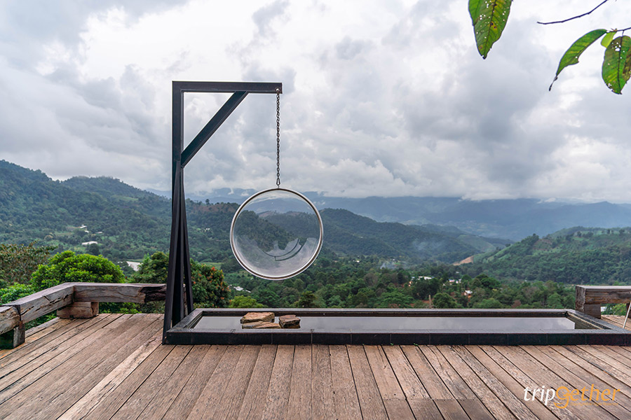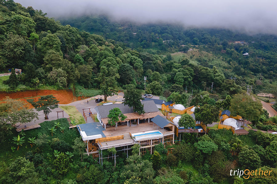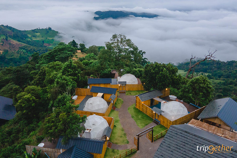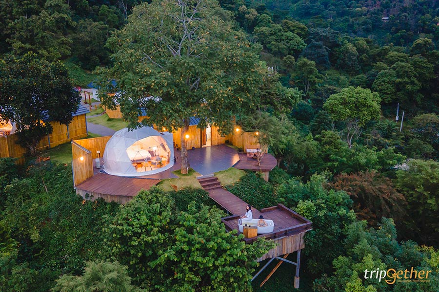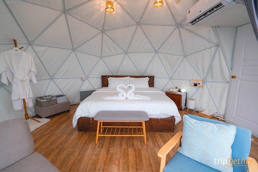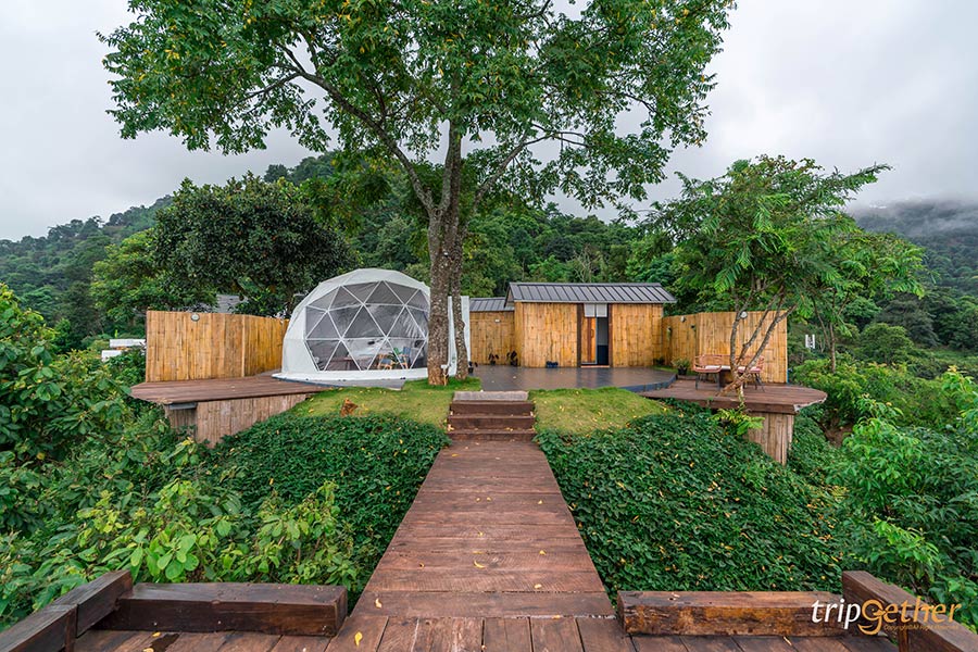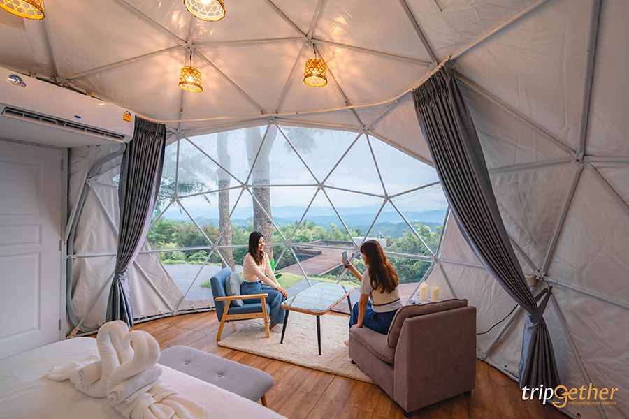ตัวที่พักเป็นเต็นท์โดมที่ด้านหน้าโปร่งใส สามารถนอนมองวิวดอยช้างได้แบบ 360 องศาตั้งแต่บนเตียง มีห้องน้ำส่วนตัวตั้งแยกออกมาข้างๆ มีบริเวณโต๊ะเก้าอี้ด้านนอกให้นั่งเล่นชมวิวและพักผ่อน หรือจะสั่งอาหารมากินที่บริเวณนี้ก็ได้เช่นกัน