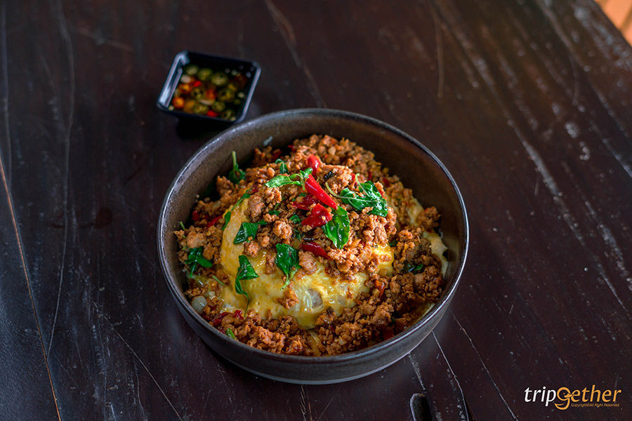 มาเริ่มที่เมนูอาหารจานแรก ข้าวไข่ข้นกะเพราหมู เสิร์ฟมาแบบจานใหญ่มาก กะเพรารสชาติจัดจ้านเข้ากับไข่ข้นและข้าวสวยร้อนๆ ได้เป็นอย่างดี จานนี้ราคา 100 บาท