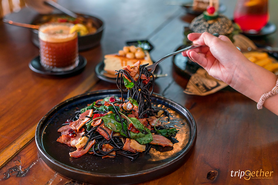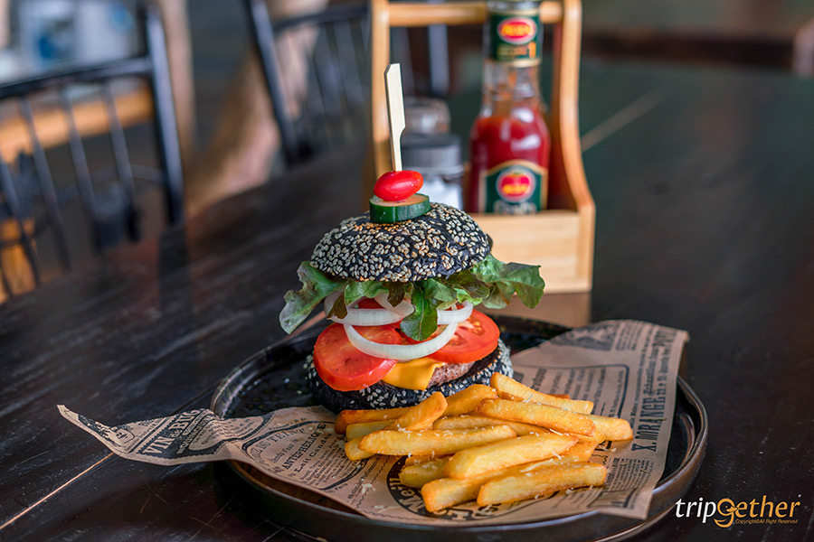 มาต่อกันที่เมนูอาหารยุโรปสไตล์ฟิวชั่นกันบ้าง ชาโคลเบอร์เกอร์เนื้อ เป็นเบอร์เกอร์แป้งชาโคล ข้างในยัดใส้แน่นๆ ทั้งเนื้อ ชีส และผัก เสิร์ฟพร้อมเฟรนซ์ฟรายทอดกรอบร้อนๆ เป็นเมนูที่กินง่ายและอิ่มคุ้มราคามากๆ จานนี้ราคา 250 บาท