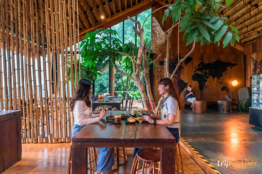 ที่นี่กว้างขวางมาก มีเนื้อที่กว่า 30 ไร่ ตัวร้านแบ่งออกเป็น 2 โซนด้วยกัน มีโซนคาเฟ่ที่เป็นที่นั่งใต้อาคาร ตกแต่งด้วยวัสดุธรรมชาติกลิ่นอายแบบชาวอาข่า มีเครื่องดื่มและเบเกอรี่ให้บริการ สำหรับใครที่จะแลกเครื่องดื่มก็สามารถนำตั๋วเข้ามาแลกตรงนี้ได้เลย สามารถแลกได้ทั้ง 3 เมนูด้วยกัน นั่นก็คือชาเย็น ชาพีช และกาแฟ
