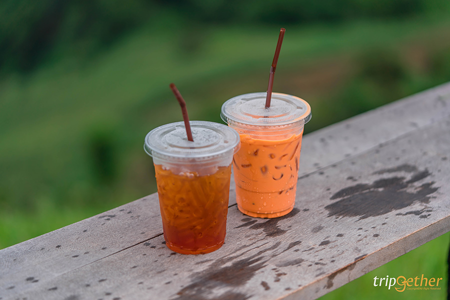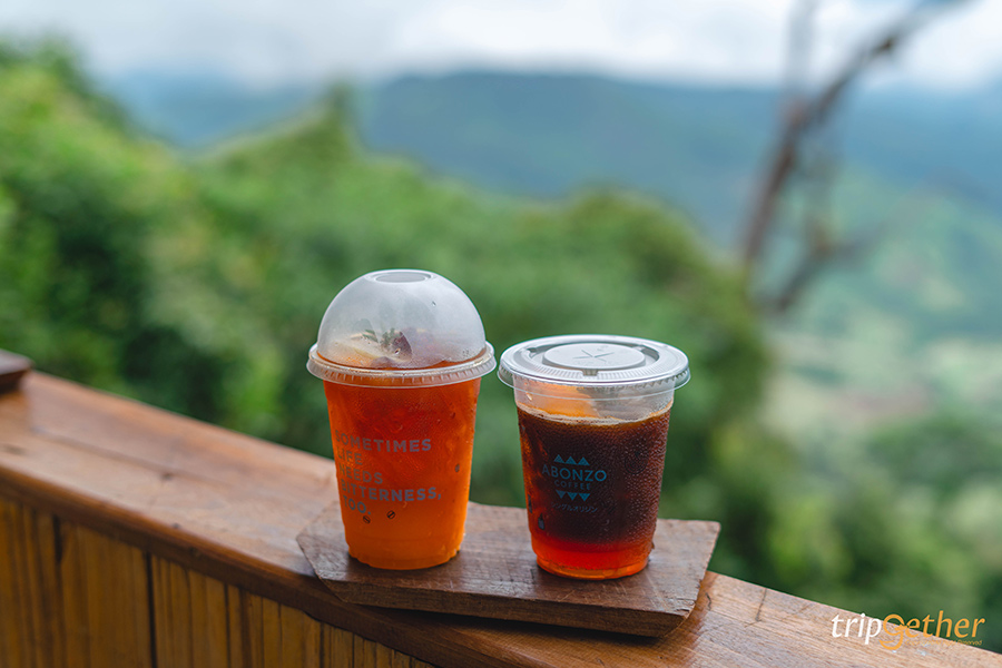 หลังจากเดินเล่นถ่ายรูปกันไปสักพัก ท้องก็เริ่มร้องอีกครั้ง เราก็เลยหาของว่างกินกันที่คาเฟ่กัน แน่นอนว่ามาดอยช้างก็ต้องกินกาแฟ เราสั่งเมนูเครื่องดื่มกัน 2 แก้ว เป็น Peach Tea Espresso Shot และ Fresh Orange Cold Brew Shot ทั้ง 2 แก้วราคา 100 บาท