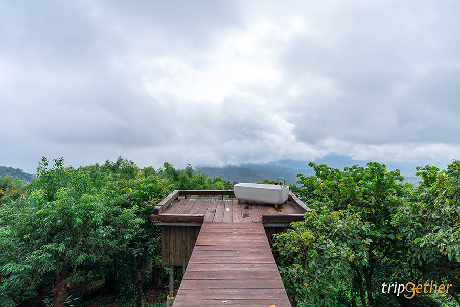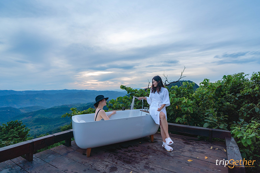มุมไฮไลท์อีกหนึ่งมุมของที่พัก ก็คือมีอ่างอาบน้ำนั่นเอง ส่วนของอ่างอาบน้ำจะเป็นระเบียงยื่นออกไปอีก ได้แบ็คกราวน์พื้นหลังที่สวยสุดๆ ใครเป็นสายคอนเทนต์ต้องถูกใจแน่นอน นอนแช่อ่างชมทะเลหมอกกันไป ผ่อนคลายมาก