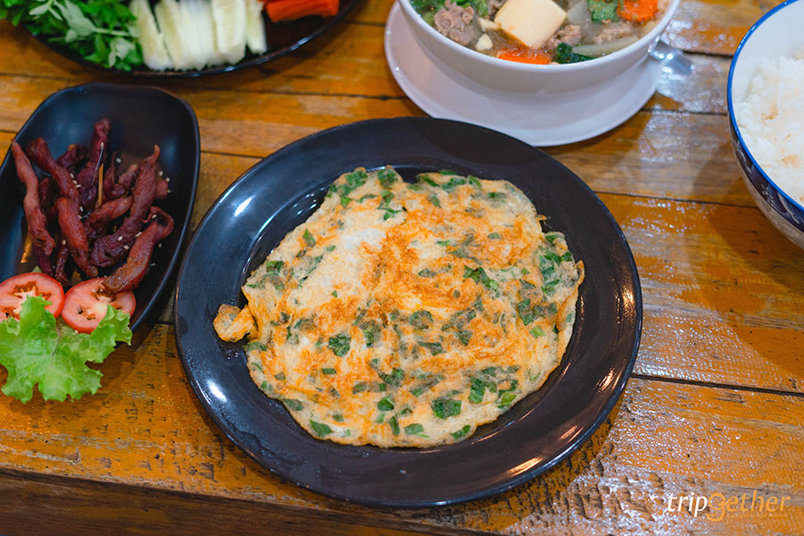 ส่วนใครไม่กินเผ็ดก็มีเมนูกินง่ายๆ อย่างไข่เจียวหอมชู