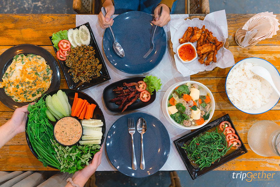 แต่ละเมนูเสิร์ฟอย่างจัดเต็ม รวมถึงใช้วัตถุดิบออแกร์นิคจากบนดอยช้างด้วย ในเซ็ตนี้ประกอบไปด้วย ไข่เจียวหอมชู ยอดมะระหวาน ลาบหมูอาข่า หมูแดดเดียว ไก่ทอด และชุดน้ำพริกอาข่าผักรวม