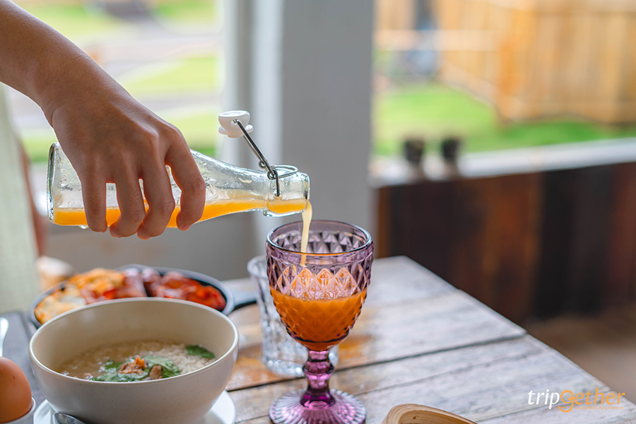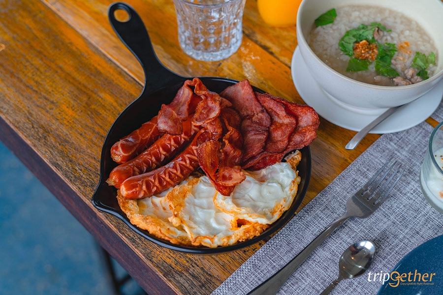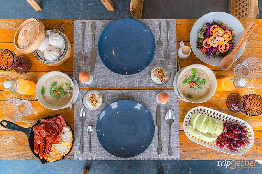 เซ็ตอาหารเช้าจะประกอบไปด้วยข้าวต้มหมู ไข่ดาว ไส้กรอกและเบคอนทอดกรอบ ไข่ต้ม สลัดทูน่า ซาลาเปา โยเกิร์ต และผลไม้ตามฤดูกาล ส่วนเครื่องดื่มมีเสิร์ฟเป็นน้ำส้มคั้นสด เติมความสดชื่นกันตั้งแต่เช้า และอาหารเช้ารวมมาในราคาของที่พักแล้ว บอกเลยว่าคุ้มมากๆ
