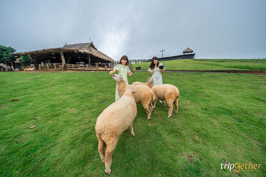 ส่วนอีกโซนจะเป็นโซนทุ่งหญ้ากว้างที่มีน้องแกะน้อยใหญ่วิ่งเล่นเต็มไปหมด พร้อมมีโซนที่นั่งเอาท์ดอร์ให้นั่งพักเหนื่อยหรือชมธรรมชาติ แต่ก่อนจะออกไปวิ่งเล่นและถ่ายรูปสวยๆ กับน้องแกะก็ต้องแวะซื้ออาหารให้น้องๆ ก่อน ที่นี่จะมีอาหารขายทั้งแบบแครอทและอาหารเม็ด ราคา 30 บาท/ถาด และตอนที่เราไปมีโปรโมชั่นซื้อ 4 ถาดแถม 1 ถาด ก็จัดกันมาเลย 5 ถาด