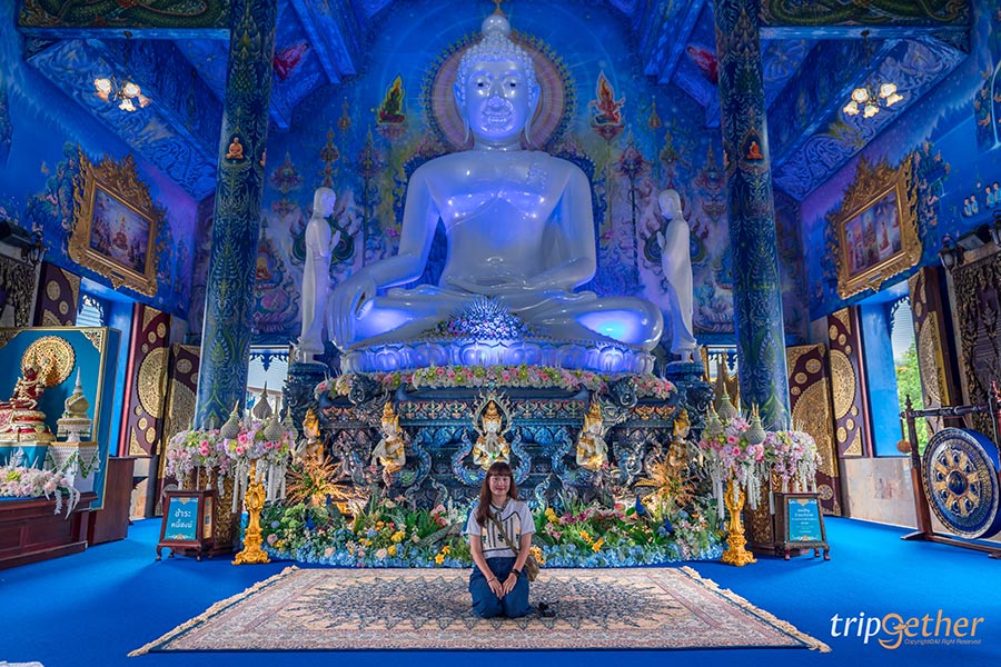 ส่วนในวิหารจะประดิษฐานพระประธาน มีชื่อเรียกว่าพระพุทธรัชมงคลบดีตรีโลกนาถ เป็นพระพุทธรูปสีขาวมุก สูงกว่า 6.5 เมตร รอบๆ ผนังตกแต่งด้วยจิตรกรรมฝาผนังเกี่ยวกับพระพุทธศาสนา ใครมาเชียงรายต้องไม่พลาดที่จะแวะมากราบไหว้