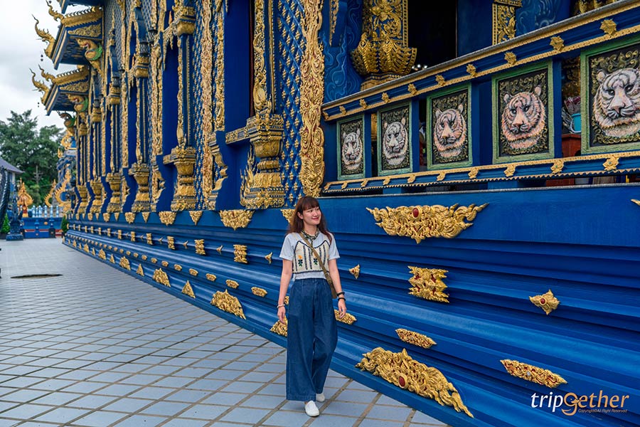 ตัววัดเป็นสีน้ำเงินตัดสลับกับสีทองทั่วทั้งวัด สวยงามตระการตามากจริงๆ ด้านหน้าวิหารจะมีรูปปั้นพญานาคสองตัว แกะสลักออกมาได้สมจริงมาก