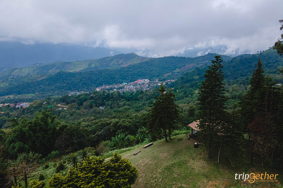 ตรงจุดชมวิวโอบล้อมไปด้วยบรรดาต้นไม้น้อยใหญ่เต็มไปหมด บรรยากาศร่มรื่นสุดๆ