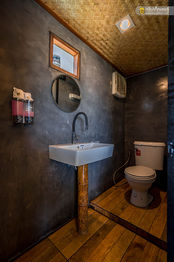 สำหรับห้องน้ำก็สะอาดสะอ้าน ตกแต่งด้วยกระเบื้องสีน้ำตาลเข้ากับตัวห้องนอน และเซ็ตสุขภัณฑ์สีขาวเพิ่มความเรียบหรู พร้อมเครื่องทำน้ำอุ่นระบบแก๊สให้อาบน้ำกันแบบไม่ต้องกลัวหนาว แถมในห้องน้ำยังมีครีมอาบน้ำและแชมพูไว้ให้อีกด้วย