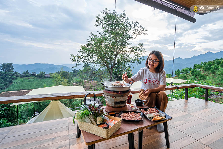 กลับมาถึงที่พักในช่วงเย็น แสงอ่อนๆ จากพระทิตย์ที่กำลังตกดินบวกกับลมพัดเย็นๆ คงไม่มีอะไรที่ฟินไปกว่าการนั่งปิ้งย่างหมูกระทะที่ระเบียงห้องอีกแล้ว วันนี้เราสั่งหมูกระทะของ บ้านว้าวด้า โฮมสเตย์ มากิน ราคา 399 บาท