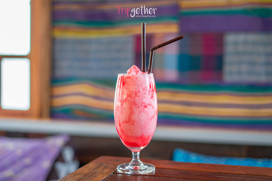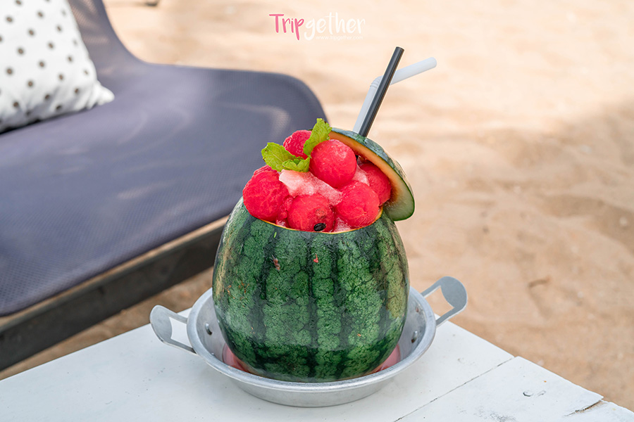 เมนูสุดสดชื่นที่มาแล้วห้ามพลาดก็คือ น้ำแตงโมปั่น ที่เสิร์ฟในแตงโตลูกโตๆ และ Red Seed Mocktail ที่จัดเต็มไปด้วยผลไม้สดๆ ทั้งบูลเบอร์รี่ ทับทิม สตอว์เบอร์รี่ ส้ม และสัปรดชิ้นโต ที่จะช่วยรีเฟรชร่างกายให้สดชื่นจากความร้อนได้เป็นอย่างดี