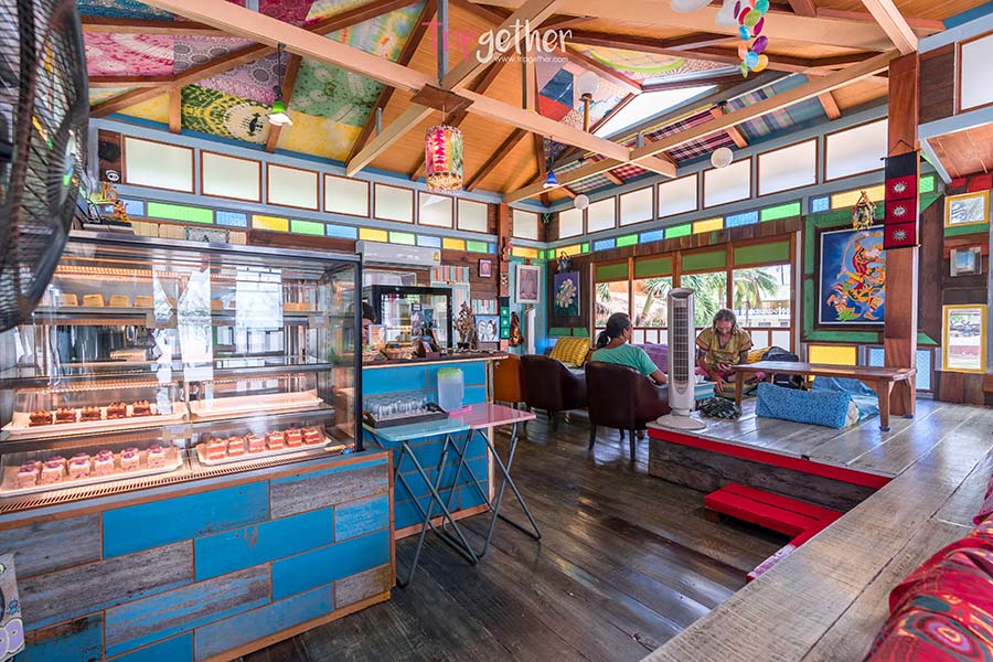 ภายในร้านก็ยังคงตกแต่งด้วยไม้และเพิ่มลูกเล่นด้วยการใช้สีสดใสและโดดเด่นด้วยตัวพนังและเพดานร้านที่ใช้ผ้าหลากหลายลวดลายมาตกแต่งด้วยเทคนิคแพทเวิร์คหรือการนำผ้าหลายๆ ชิ้นมาเย็นต่อกัน และยังมีผลงานศิลปะท่ีแขวนอยู่ที่ผนังให้เราได้ดูอีกด้วย